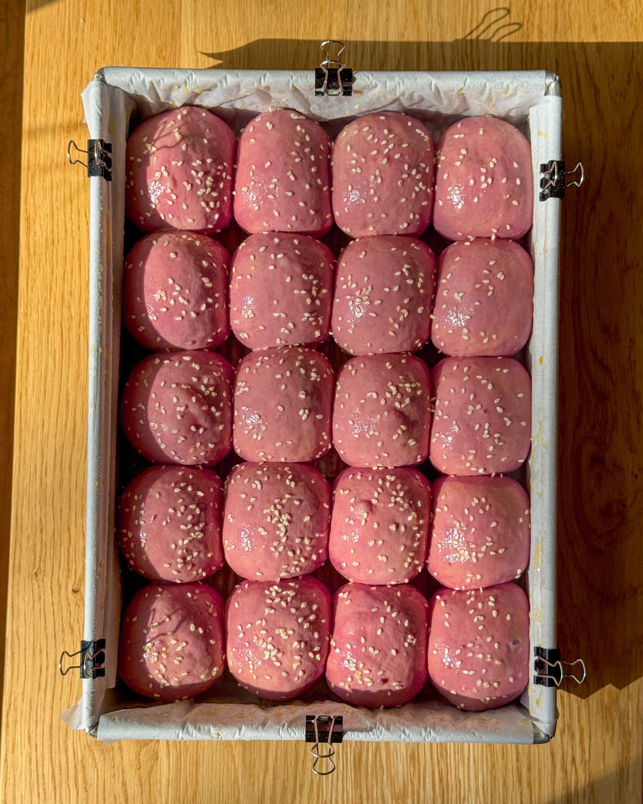 Brush the buns with egg wash, sprinkle some sesame seeds on top, and bake for 20-22 minutes, or until golden brown and internal temperature reaches 190F or 87C.