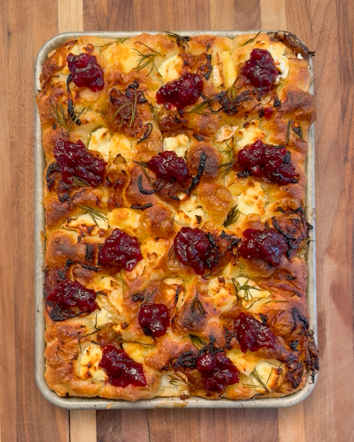 Spoon the cranberry sauce over the focaccia just before serving. Slice and enjoy warm or at room temperature.